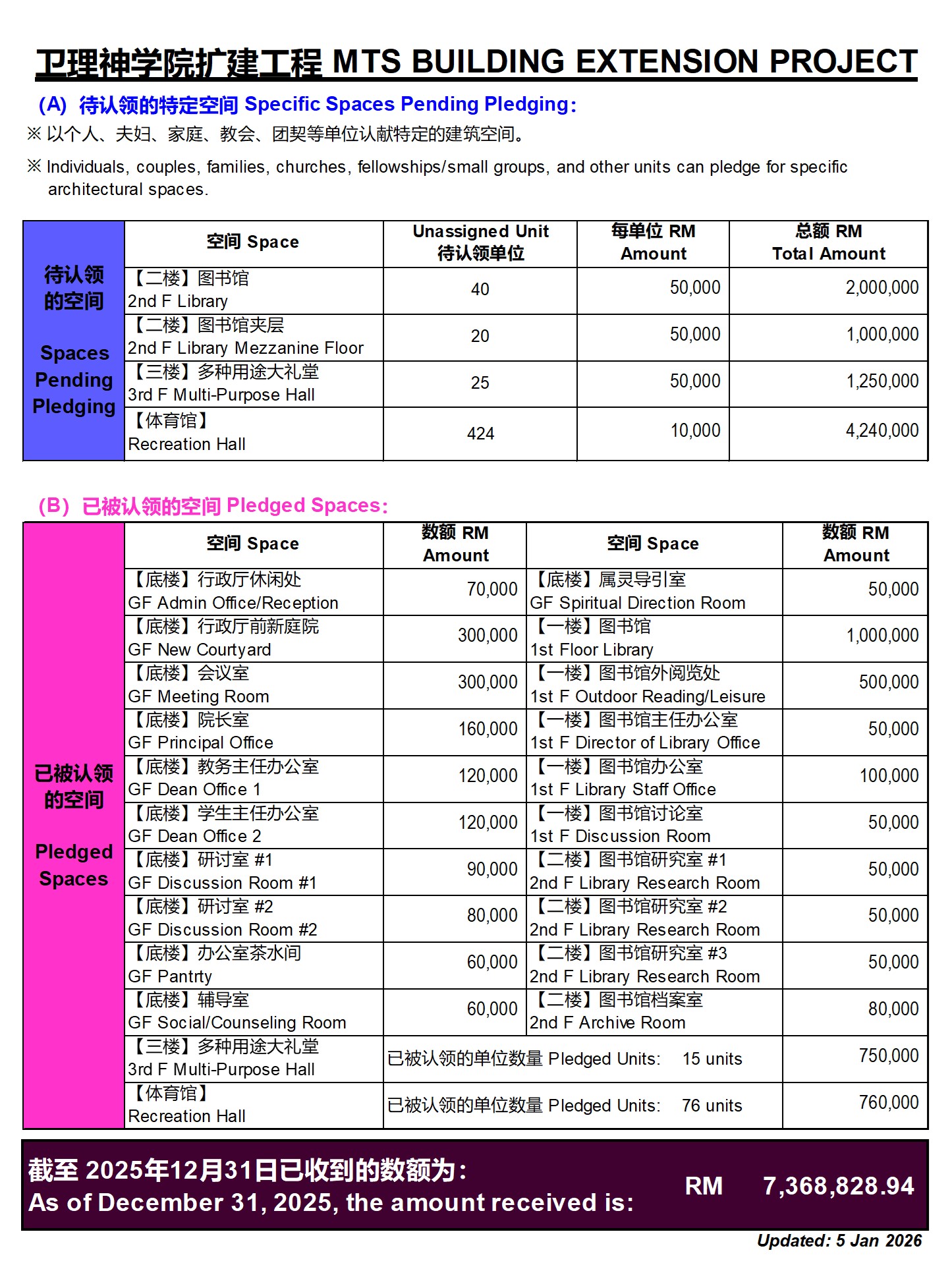 (更新至31/12/2025)卫神扩建工程筹款近况 | Pledging Status for Building Extension Project as at December 31, 2025 6 January 2026 Submitted by admin on 6 January 2026 Details | 详细 Log in to post comments